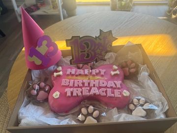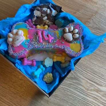 bone shaped cake choice of icing or carob. 4 large carob treats of your choice, party hat and cake topper